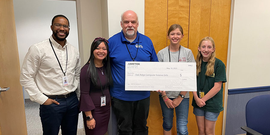 (L to R) Sempangi, Director of Human Resources for AMETEK AMT; Jenny, HR & Payroll Specialist for AMETEK AMT; the founder and members of Oak Ridge Computer Science Girls เกี่ยวกับ เซ็นเซอร์และระบบจัดการของเหลว
