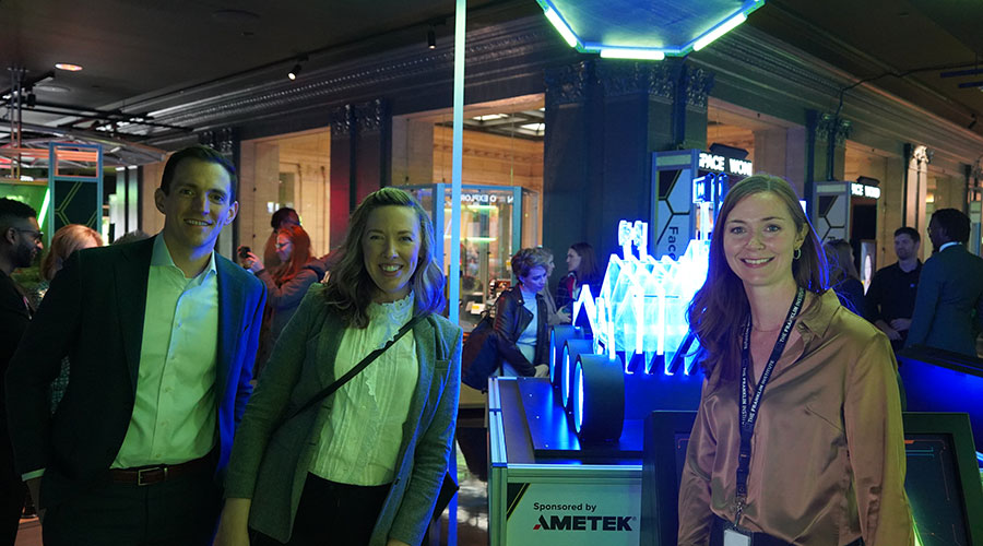 AMETEK Corporate team members pose with a partner from The Franklin Institute during the opening of Wondrous Space on November 2 Many of AMETEK’s businesses enable space exploration, including AMETEK Pacific Design Technologies (PDT), whose technologies are on display nearby the Rover Design exhibit. AMETEK PDT produces the very innovations that are used on the exploratory rovers that visitors have the chance to interface with.